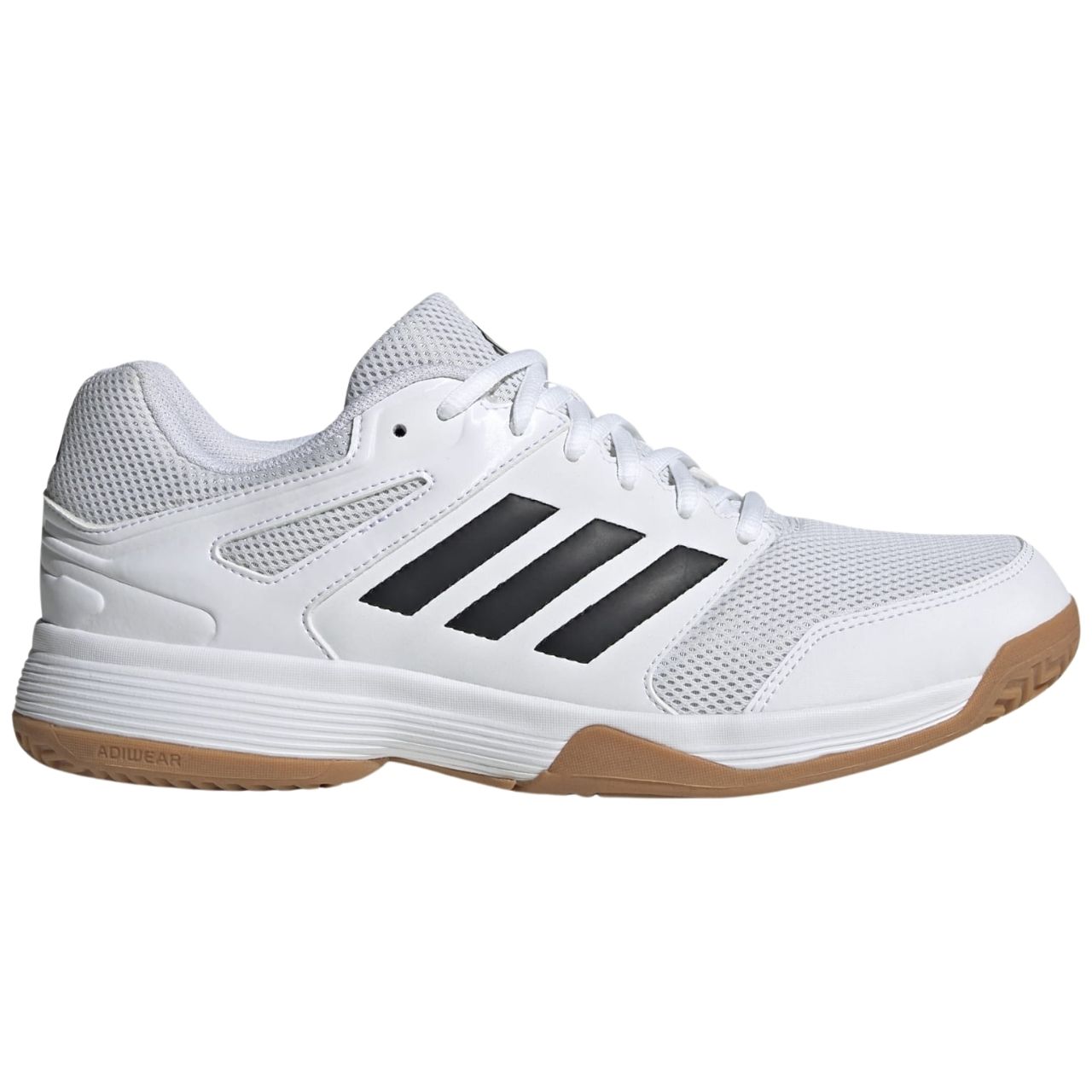 Buty męskie adidas sprawdzą się podczas rozgrywek na halowym parkiecie. Syntetyczna cholewka z siateczkowymi panelami. Klasyczne sznurowanie. Tekstylna wyściółka. Podeszwa środkowa z pianki EVA. Niebrudząca, gumowa podeszwa zewnętrzna Adiwear z przyczepnym bieżnikiem.