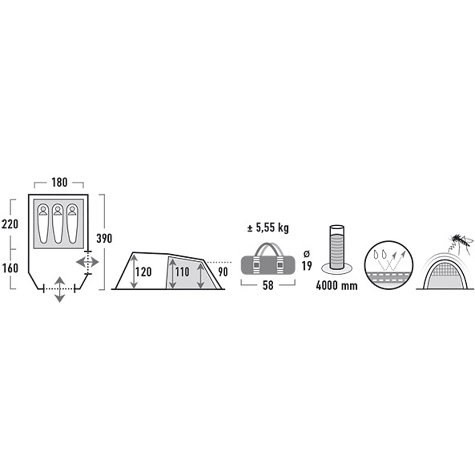 Przestronny namiot trzech osób z dwoma wejściami. Pojemny przedsionek z podłogą może być wykorzystany jako kuchnia czy pomieszczenie gospodarcze. Wejście wyposażone jest w moskitierę w celu ochrony przed owadami. Szwy laminowane i wodoodpornośc 4000mm zapewniają bardzo dobrą ochronę przed deszczem. Otwory wentylacyjne zapewniają stałą cyrkulację powietrza.